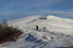 E' già piuttosto tardi e la fame si fa sentire: mangiamo al volo due cioccolatini e ci incamminiamo verso il Monte Ebro, dove abbiamo intenzione di fermarci a mangiare qualcosa di più sostanzioso, anche perché qui il vento è forte e fastidioso. Le ciaspole, per salire sull'Ebro, obiettivamente non servono visto che sia il versante meridionale della montagna che il sentiero sono praticamente stati spazzati dal vento: le insidie maggiori, in questo tratto, vengono dal terreno eccessivamente molle, quasi fangoso, sul quale bisogna stare attenti a non scivolare. Mentre camminiamo, la nostra attenzione viene attirata dal riflesso del sole nelle acque del mar Ligure, ben visibile in lontananza, anche se notiamo che alcune nubi minacciose si stanno addensando sulle montagne in direzione del mare.