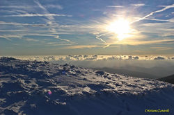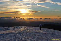 Io mi attardo a scattare qualche bella foto dalla cima del Chiappo, poi mi incammino sulla dorsale innevata che collega la vetta della montagna alle Capanne di Cosola: la vista è altrettanto bella, forse ancora di più e mentre scendo riesco a immortalare un tramonto da lasciare senza fiato. Il sole filtra tra le nubi basse che sovrastano il mare, illuminando il paesaggio di una luce unica, con la neve che, riflettendola, si colora di arancione. Ho freddo e mal di testa, il vento è fastidioso, ma vista la fatica fatta per arrivare qui sopra, tengo duro e continuo a fotografare mentre scendo verso la nostra destinazione.